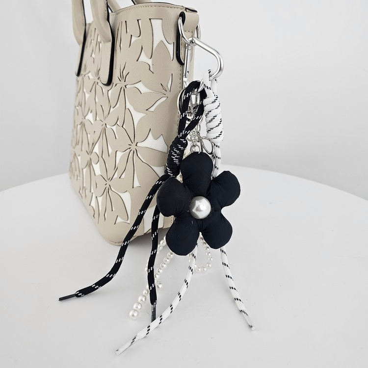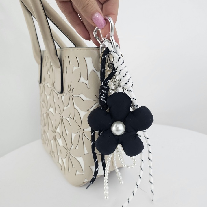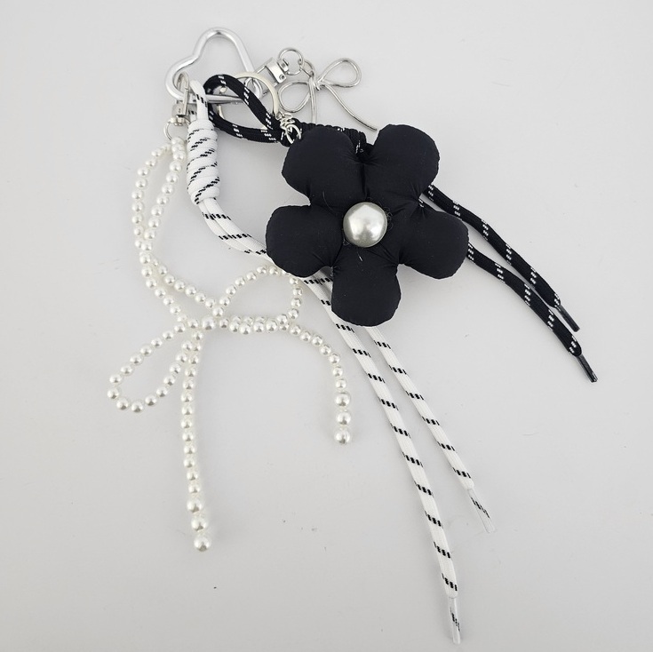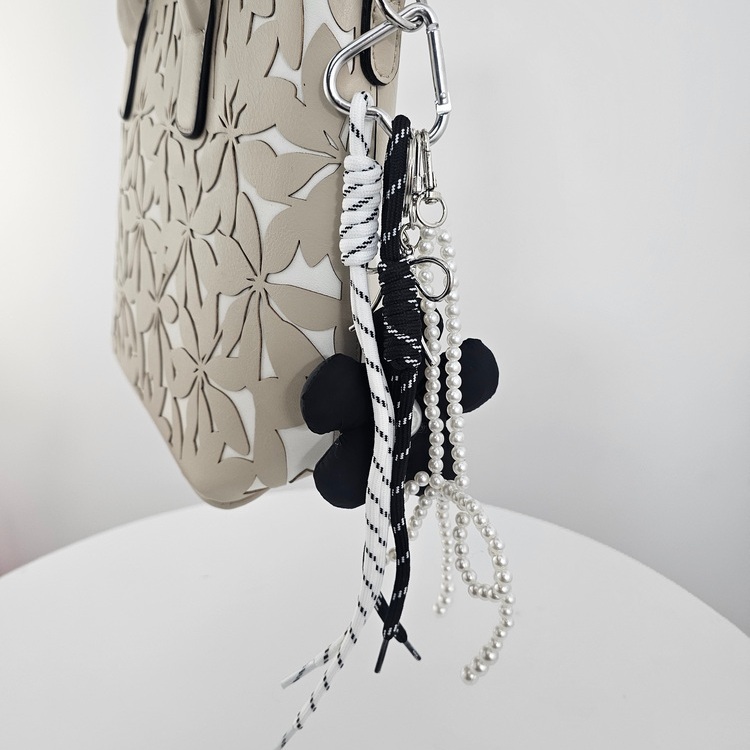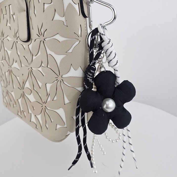 Ten efektowny brelok to najprostszy sposób, by nadać ulubionej torebce zupełnie nowy, unikalny charakter. Kompozycja składa się z kilku współgrających elementów: eleganckiego sznura pereł ułożonego w subtelną kokardę, kontrastujących czarno-białych splotów oraz miękkiego, materiałowego kwiatu z perłowym środkiem. Całość została zaprojektowana tak, by przyciągać wzrok i dodawać stylizacji lekkości oraz modowego sznytu. Solidne zapięcie w kształcie serca pozwala na błyskawiczne przepięcie breloka między torebką, plecakiem czy kluczami, dając nieograniczone możliwości personalizacji wyglądu. To dodatek, który wyróżnia się finezją i sprawia, że nawet klasyczne akcesoria zyskują nowoczesny, artystyczny wymiar.