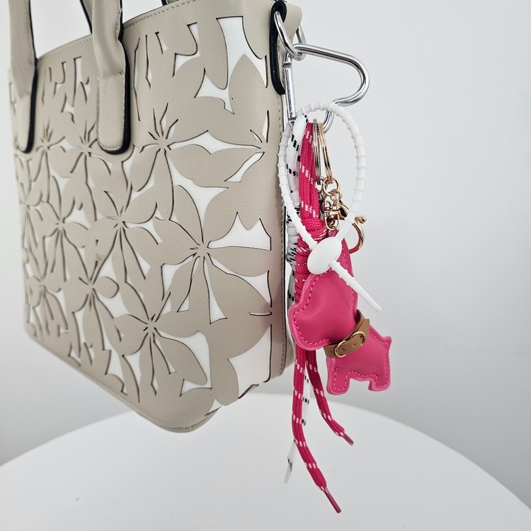Brelok biżuteryjny Sporty Chic z pieskiem to idealne połączenie elegancji i sportowego luzu, które błyskawicznie odmieni charakter każdej torebki czy plecaka. Centralnym punktem kompozycji jest urocza zawieszka w kształcie beżowego pieska, otoczona mini-replikami akcesoriów sportowych: rakietą tenisową oraz lotką. Całość uzupełniają dynamiczne, tekstylne sznury w kontrastujących odcieniach beżu i czerni z metalicznym splotem. Solidne zapięcie pozwala na łatwą personalizację ulubionych akcesoriów, dodając im unikalnego, modowego sznytu. To dodatek, który wyróżnia się finezją i sprawia, że nawet najprostsza stylizacja zyskuje nowoczesny, artystyczny wymiar, idealny dla osób ceniących oryginalność.