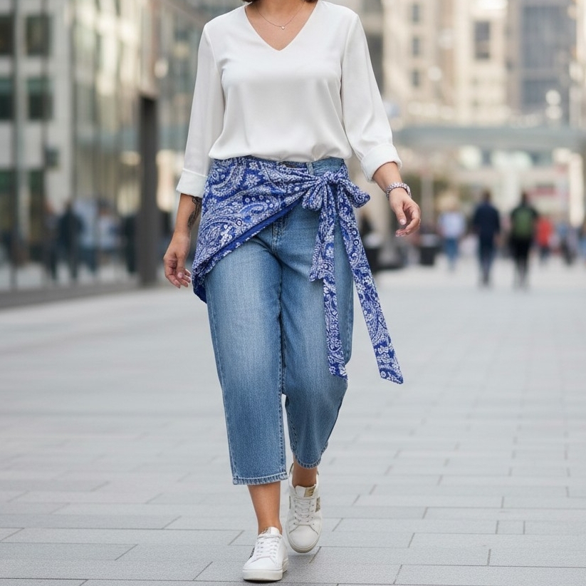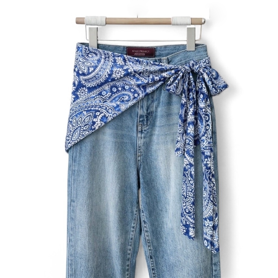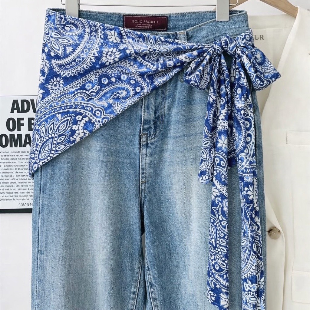 Fason został zaprojektowany z myślą o noszeniu w formie paska, co umożliwia fantazyjne wiązanie na boku i dodanie unikalnego akcentu do spodni, szczególnie jeansów. Długość produktu pozwala na tworzenie dekoracyjnych splotów lub puszczenie końców luźno wzdłuż nogawki. To produkt, który błyskawicznie zmienia charakter klasycznych stylizacji, dodając im lekkości i nowoczesnego stylu.