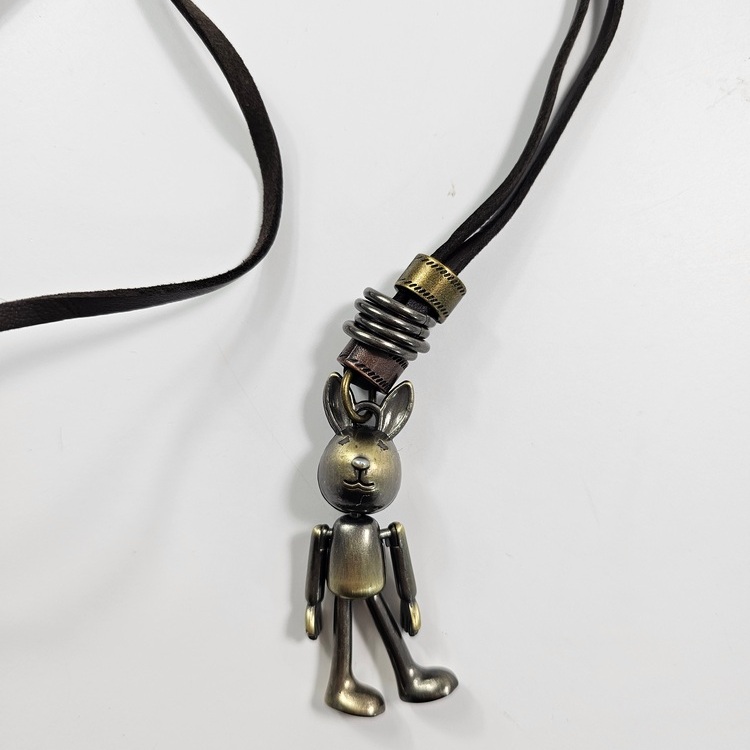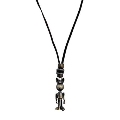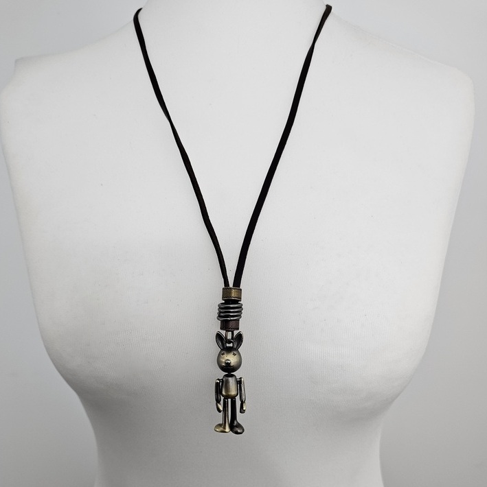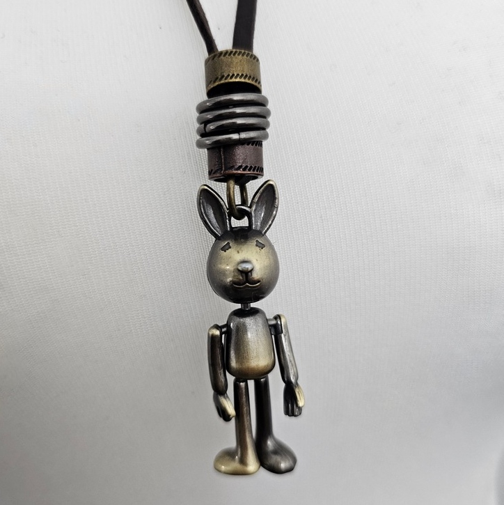 Długi wisior na rzemyku Zając to oryginalna biżuteria, która od razu przyciąga wzrok. Metalowy robot z efektownymi detalami i drobnymi zdobieniami tworzy dekoracyjny, lekko retro wygląd, idealny do codziennych stylizacji. Zając jest ruchomy, ręce i nogi poruszają się swobodnie. Rzemyk jest lekki i wygodny, a długość pozwala nosić wisior swobodnie na swetrze, koszulce czy sukience. To świetny dodatek dla osób, które lubią nietypowe akcenty i biżuterię z charakterem. Idealny również jako prezent.