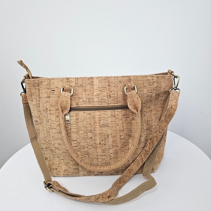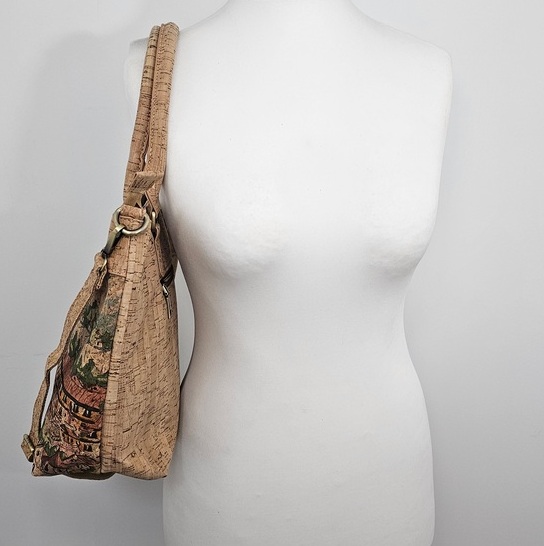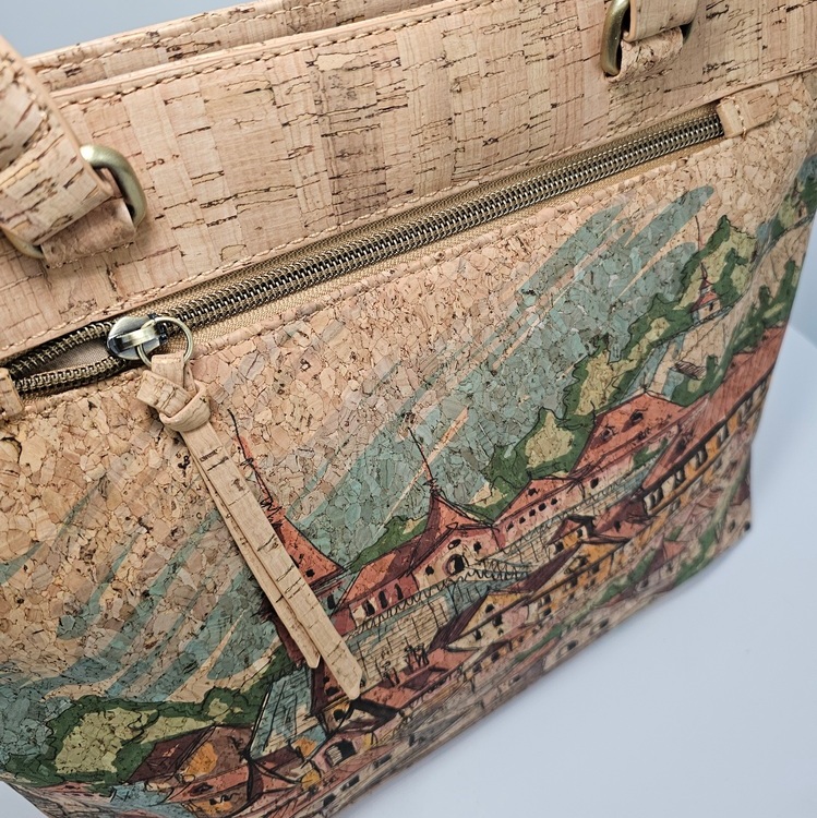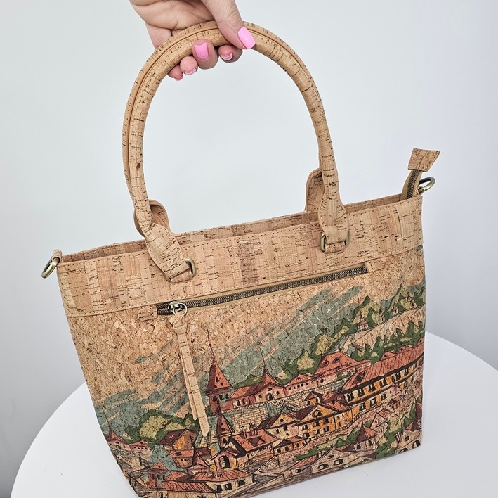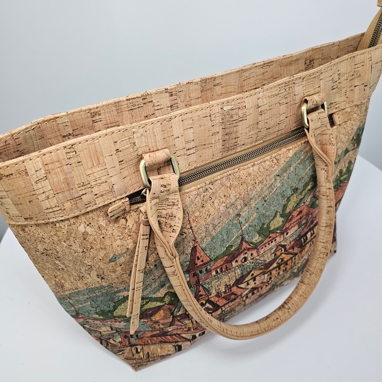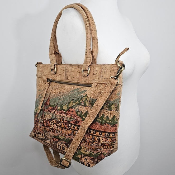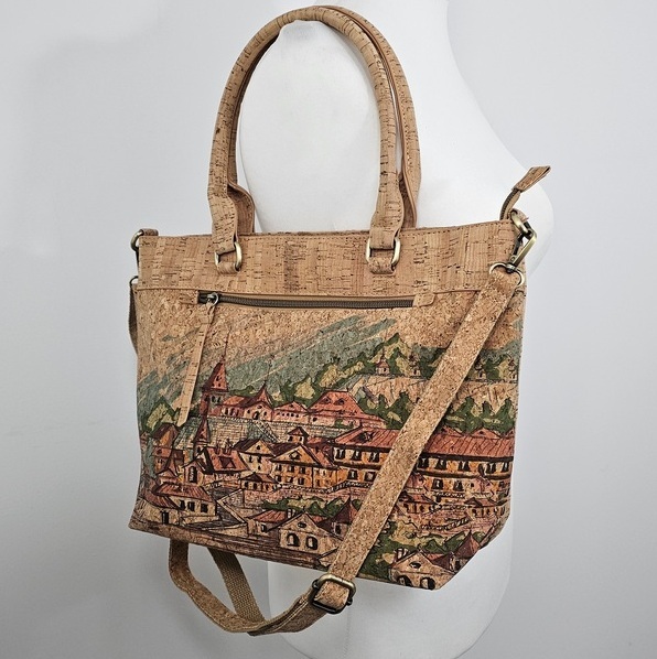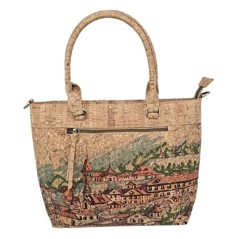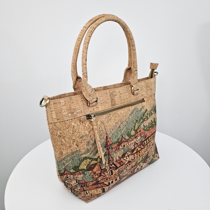 Eko torebka na ramię z korka Coimbra to lekki i wytrzymały model wykonany z korka. Przedni panel zdobi trwały nadruk z motywem miasteczka, który nadaje torebce charakterystyczny, artystyczny wygląd i wyróżnia ją spośród klasycznych modeli.