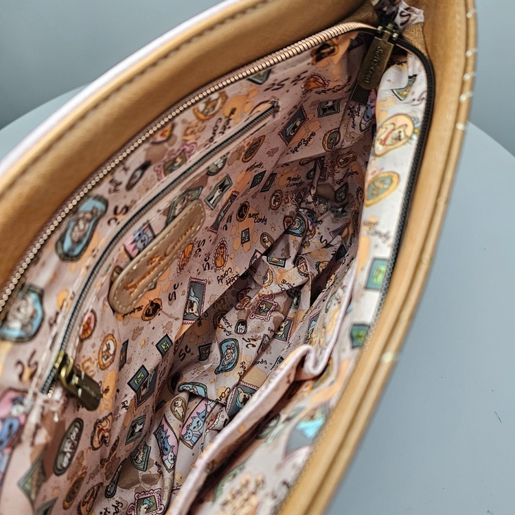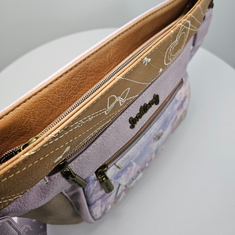 Torebka ma 1 komorę. W środku mięciutka kolorowa podszewka. Torebka posiada regulowany i odczepiany pasek, więc można ją nosić przez ramię (crossbody) i na ramieniu. Od frontu dwie kieszonki na na zamek, z tyłu na zamek. Szeroka podstawa umożliwia ustawienie torebki na stole i sprawia, że jest bardzo pakowna. Z tyłu sentencja: Wishing you a life full of adventures and new experiences (Życzymy Ci życia pełnego przygód i nowych doświadczeń), a więc torebka jest idealna na prezent.
