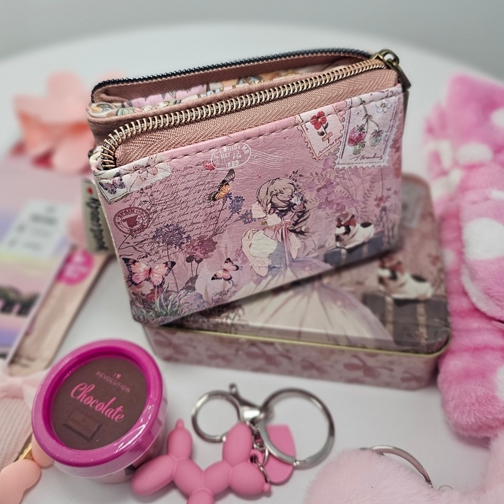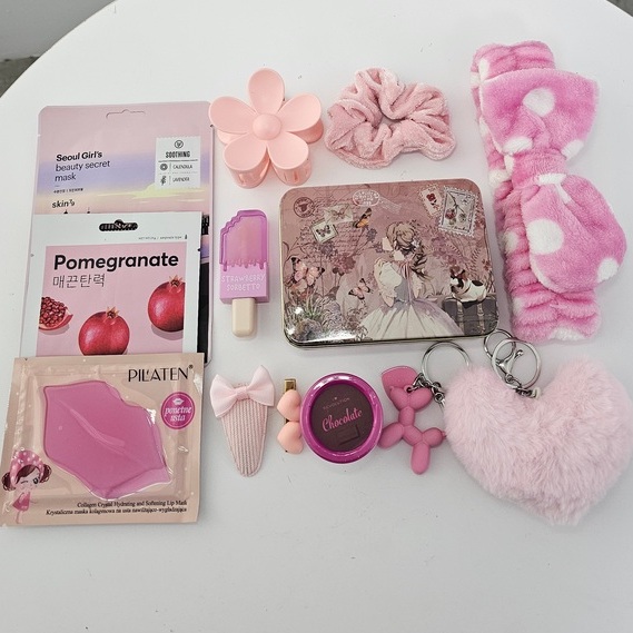 – trzykomorową portmonetkę z grafiką retro (11,50 cm x 9 cm x 2,5 cm) w aluminiowym pudełku z taką samą grafiką jak portmonetką, opaskę kosmetyczną do włosów z kokardą, 2 maseczki w płachcie, nawilżającą maskę na usta, peeling do ust w pojemniczku, błyszczyk do ust w kształcie loda, puszysty brelok serce, brelok zawieszkę pies z balonów, klamrę do włosów w kształcie kwiatka, puszystą gumkę do włosów scrunchie.
