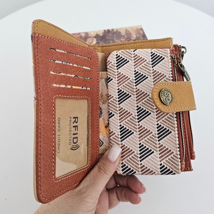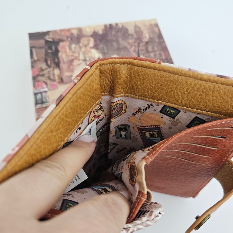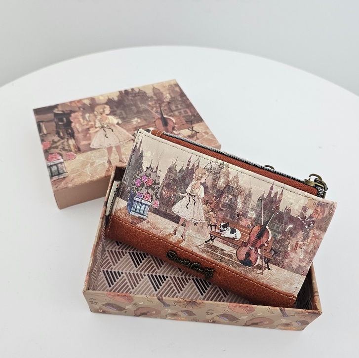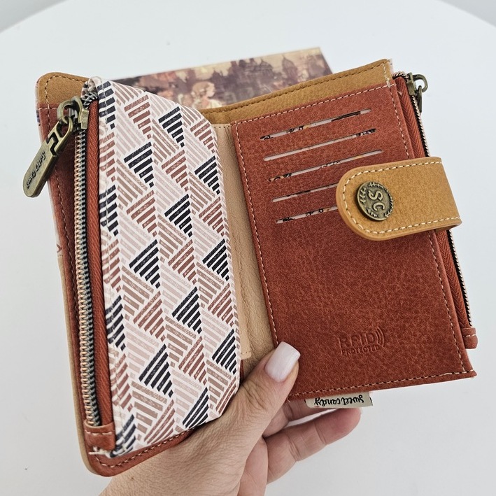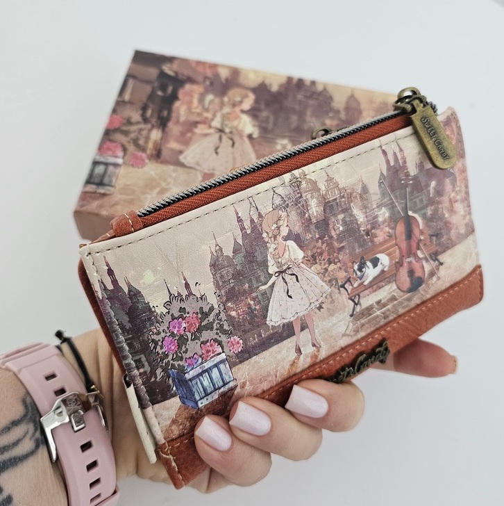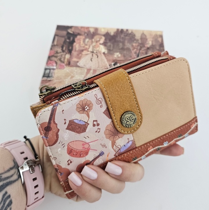 Portfel L Sweet Dreams karmelowy poza niezwykłym urokiem jest również wyjątkowo praktyczny. Posiada dwie oddzielne części na bilon zamykane na dwukolorowy suwak. Część na karty posiada dwie oddzielne przegrody, a w nich miejsce na zdjęcie. Na całej długości po otwarciu miejsce na banknoty. Kolorowa podszewka. RFID obecne.