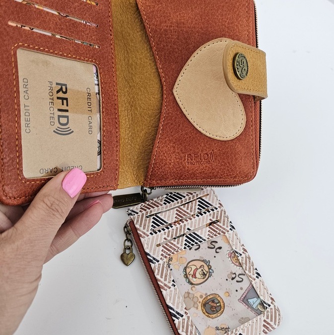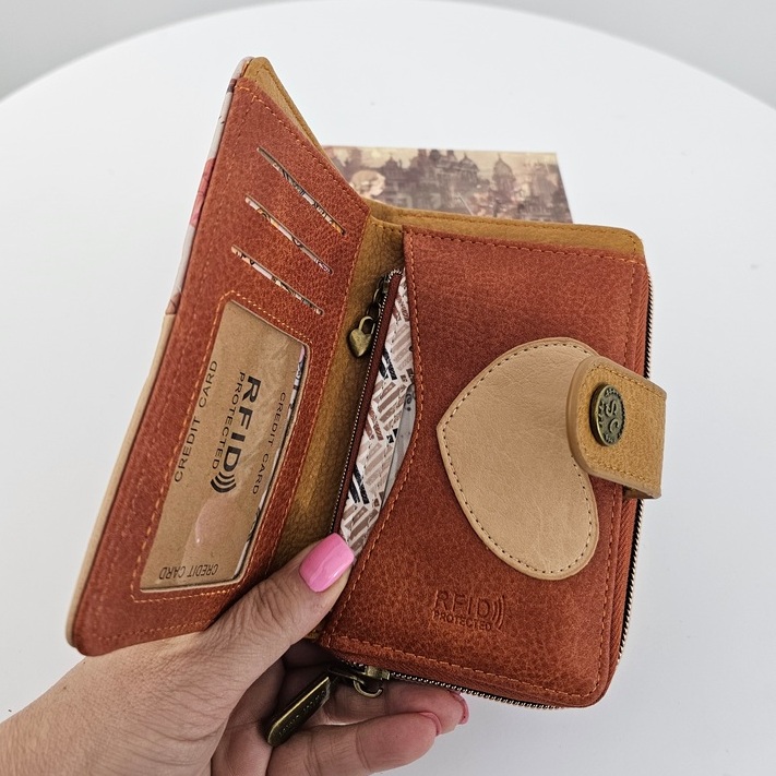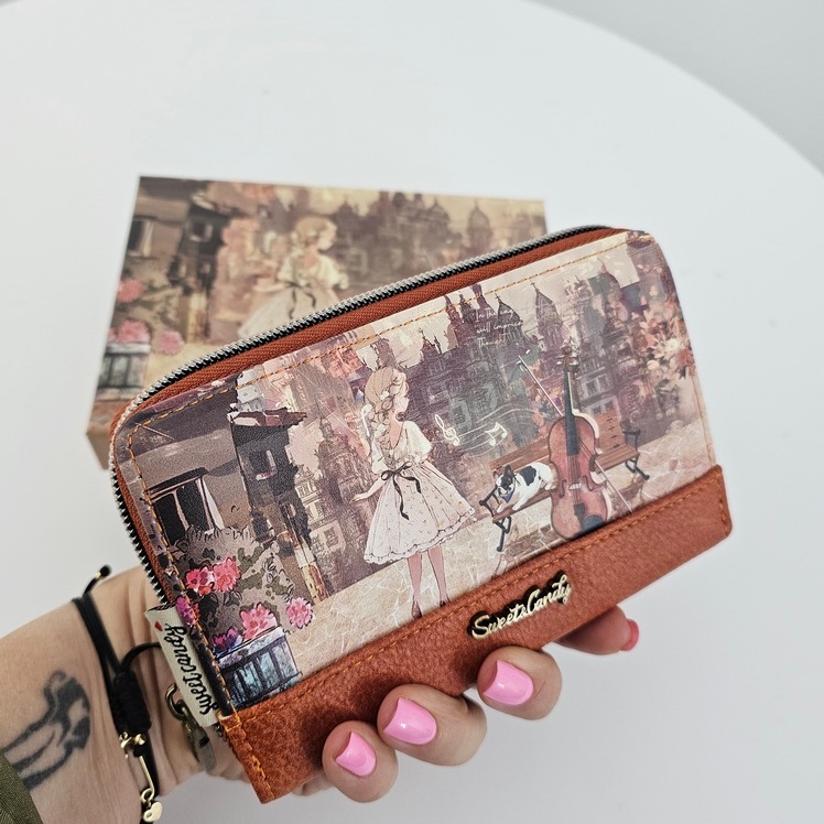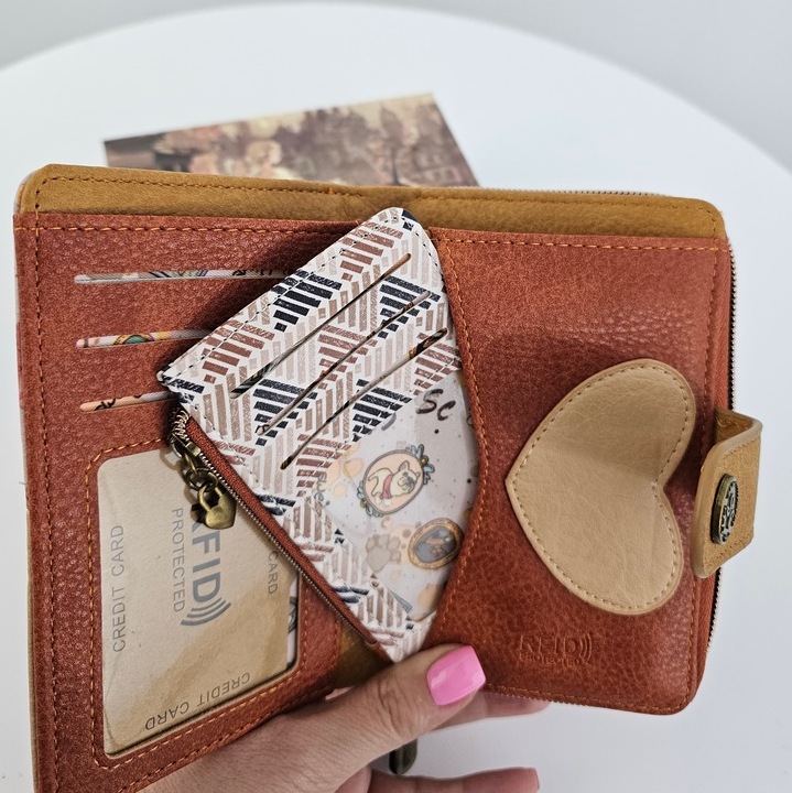 Portfel z sercem Sweet Dreams karmelowy z pudełkiem marki Sweet Candy poza niezwykłym urokiem jest również wyjątkowo praktyczny. Posiada 2 oddzielne części. Jedna jest przeznaczona na bilon i jest zamykana na suwak. Druga część na karty i banknoty posiada również miejsce na zdjęcia. W środku kolorowa podszewka. W jednej z przegródek znajduje się wyjmowana wkładka do zabrania na szybkie zakupy. Ma miejsce na karty.