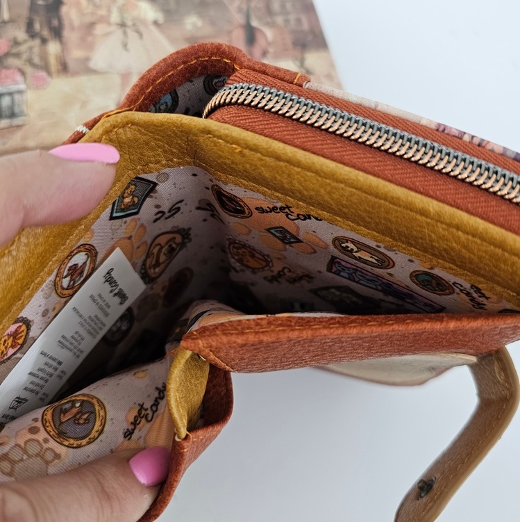 Portfel doskonale pasuje do większych torebek, do mniejszych listonoszek się nie mieści (np. do dwukomorowej torebki listonoszki Sweet Dreams).