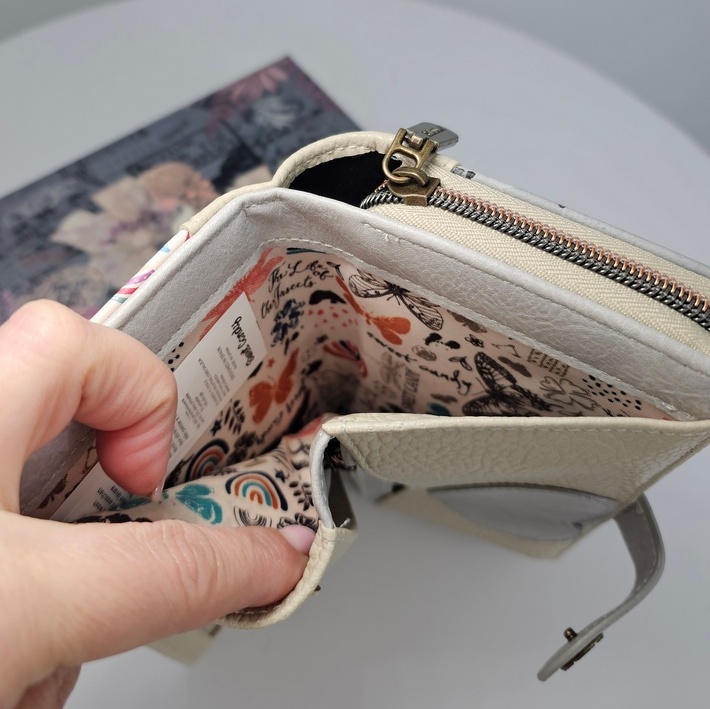 Portfel doskonale pasuje do większych torebek, do mniejszych listonoszek się nie mieści.