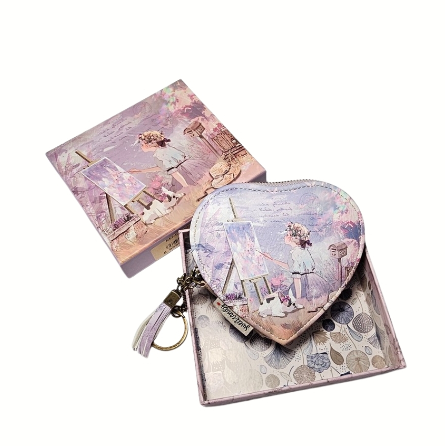 Portmonetka Sweet Dreams Heart liliowa to wyjątkowy model w kształcie serca, który łączy funkcjonalność z uroczym designem. Wykonana z wysokiej jakości materiału syntetycznego, posiada solidne zamknięcie na suwak z ozdobnym frędzlem i kółkiem do przypięcia. Wnętrze portmonetki to jedna praktyczna komora, w której bez trudu schowasz bilon, złożone banknoty czy drobne akcesoria. Dzięki kompaktowym wymiarom portmonetka Portmonetka Sweet Dreams Heart liliowa bez problemu zmieści się w każdej torebce, a eleganckie pudełko sprawia, że to także doskonały pomysł na prezent.