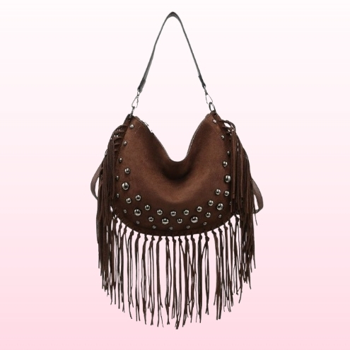 Torebka boho z frędzlami i nitami czekoladowa to wyrazisty dodatek w stylu boho, idealny do podkreślenia casualowych i festiwalowych stylizacji. Wykonana w całości z materiału syntetycznego o miękkiej, zamszowej fakturze, wyróżnia się długimi frędzlami oraz dużymi, metalicznymi nitami z przodu. Wymiary 30 × 24 × 8 cm sprawiają, że jest lekka i wygodna, a jednocześnie pomieści wszystkie niezbędne drobiazgi. Torebka posiada dwa paski – krótki uchwyt na ramię oraz długi, regulowany pasek do noszenia crossbody. Zamykana na suwak, z tylną kieszenią na zamek i wykończona podszewką wewnątrz. Model ten doskonale wpisuje się w modny trend boho, łącząc swobodę stylu z funkcjonalnością.
