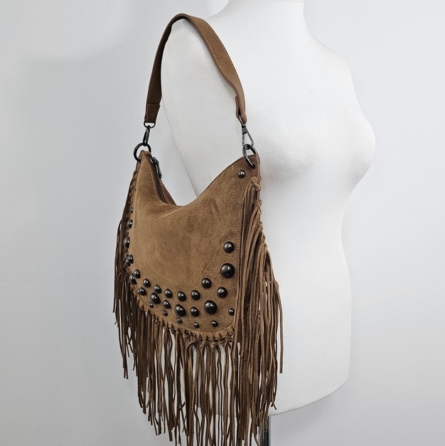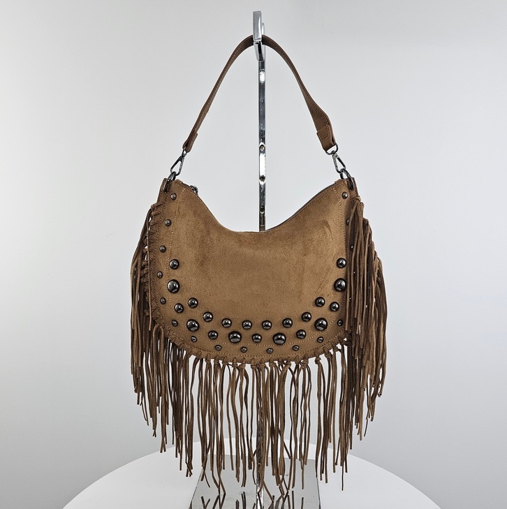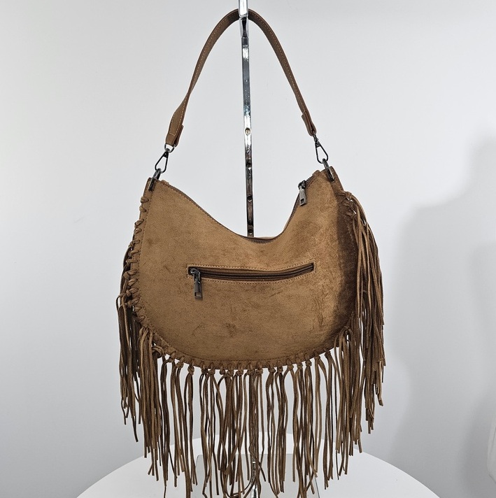 Torebka boho z frędzlami i nitami czekoladowa to wyrazisty dodatek w stylu boho, idealny do podkreślenia casualowych i festiwalowych stylizacji. Wykonana w całości z materiału syntetycznego o miękkiej, zamszowej fakturze, wyróżnia się długimi frędzlami oraz dużymi, metalicznymi nitami z przodu. Wymiary 30 × 24 × 8 cm sprawiają, że jest lekka i wygodna, a jednocześnie pomieści wszystkie niezbędne drobiazgi. Torebka posiada dwa paski – krótki uchwyt na ramię oraz długi, regulowany pasek do noszenia crossbody. Zamykana na suwak, z tylną kieszenią na zamek i wykończona podszewką wewnątrz. Model ten doskonale wpisuje się w modny trend boho, łącząc swobodę stylu z funkcjonalnością.