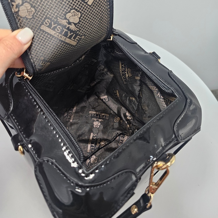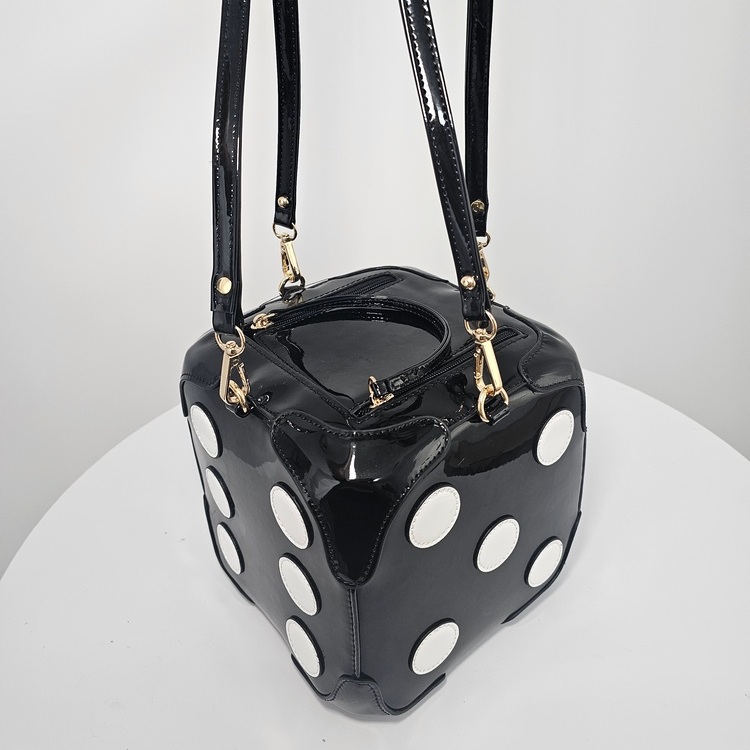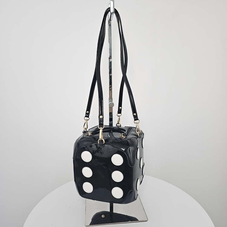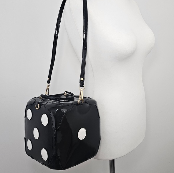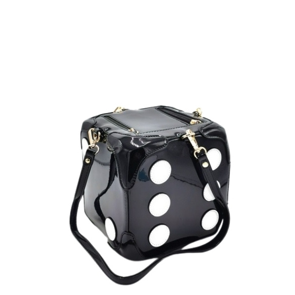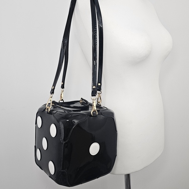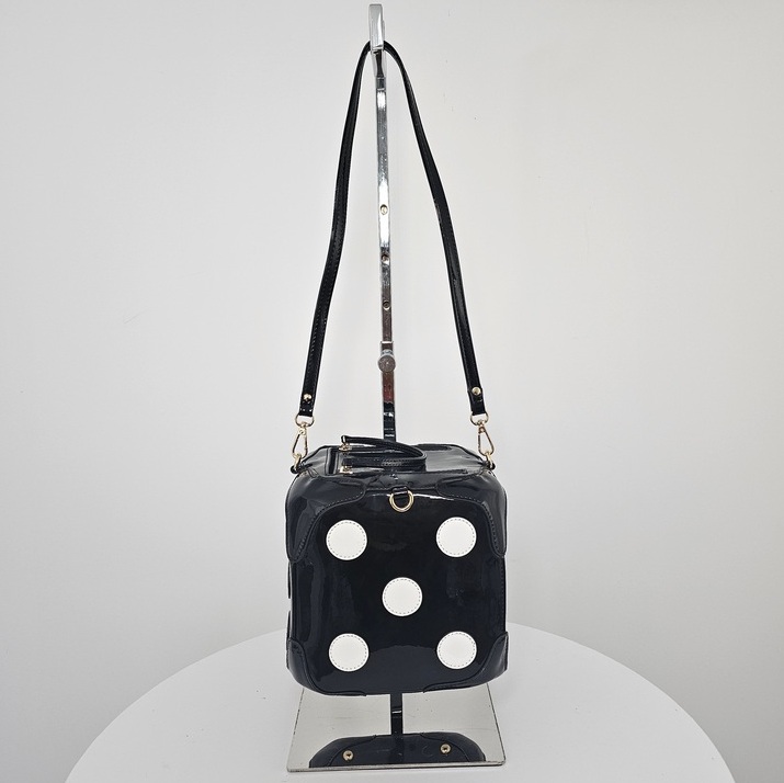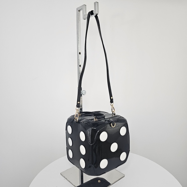 Torebka Dice Cube to wyjątkowy model, który przyciąga uwagę geometryczną formą i lakierowanym połyskiem. Wykonana z czarnej ekoskóry z kontrastowymi białymi kropkami, nawiązuje do klasycznej kostki do gry.