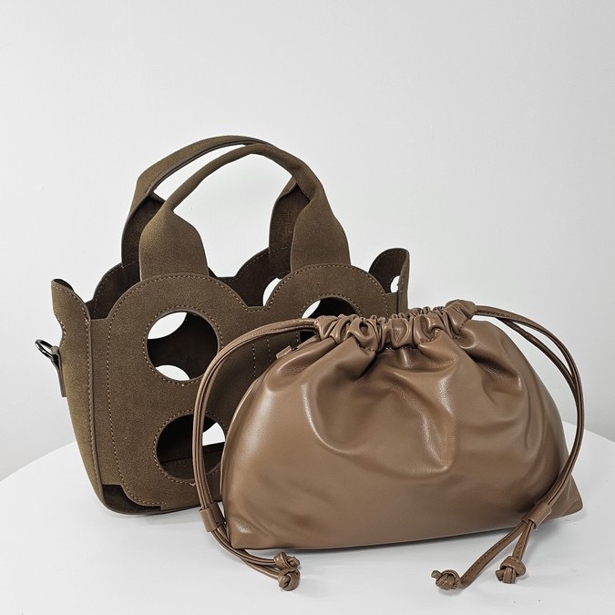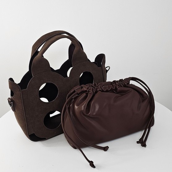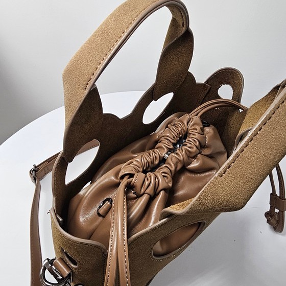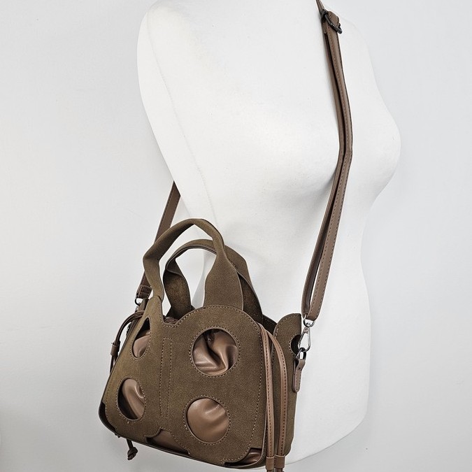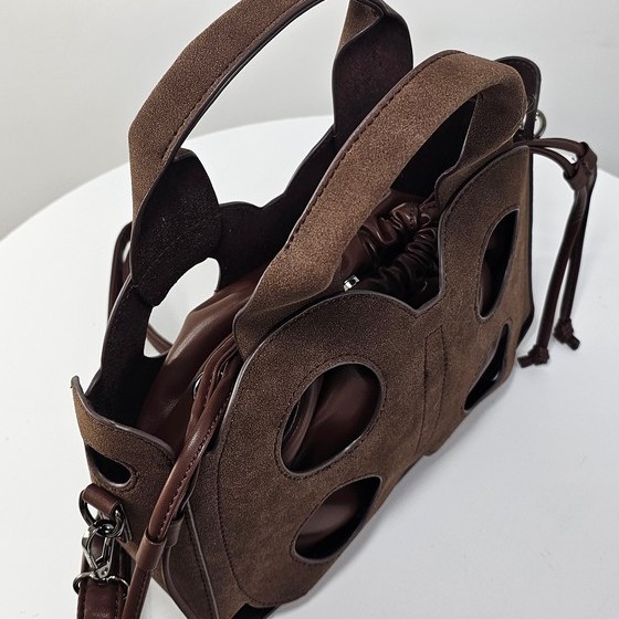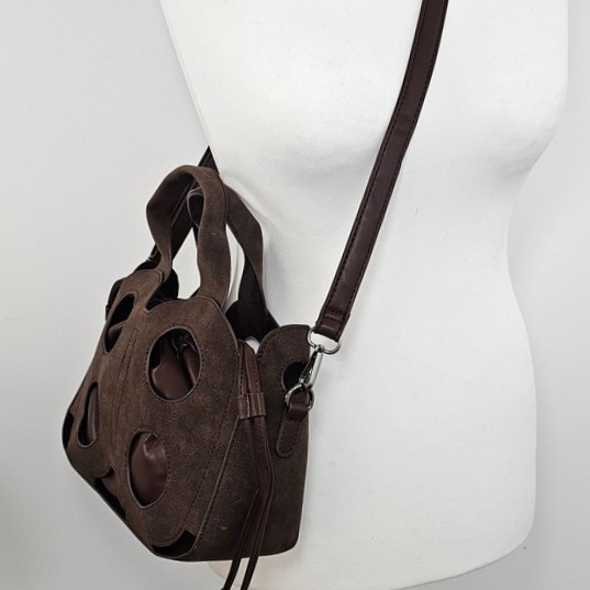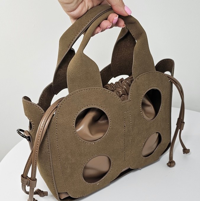 Torebka kuferek Baggy Cut to wyjątkowy model dla kobiet ceniących oryginalne formy. Wykonana z ażurowej osłony o nubukowym wykończeniu, kryje w sobie praktyczny worek z miękkiego materiału, który można nosić również samodzielnie. Model 2w1 daje swobodę stylizacji – elegancki kuferek z wycięciami albo minimalistyczna torebka w formie worka.