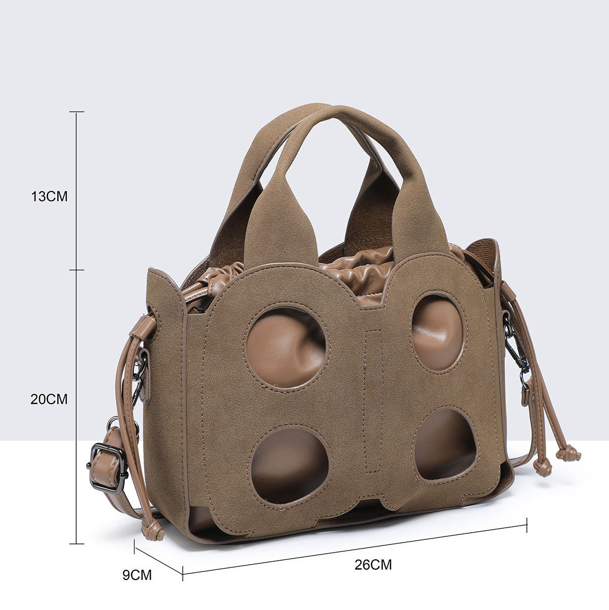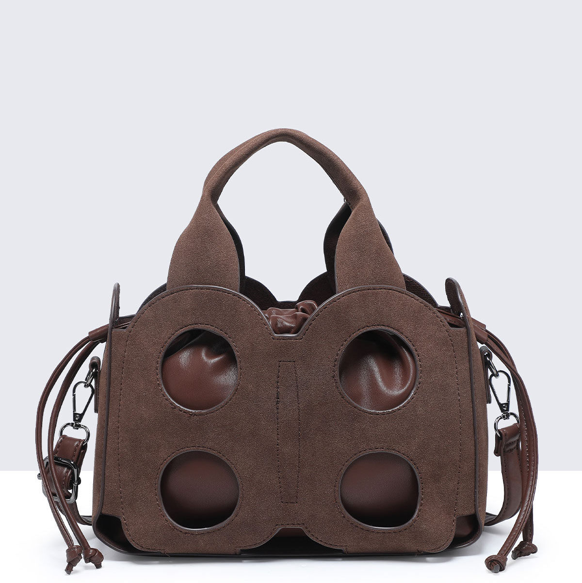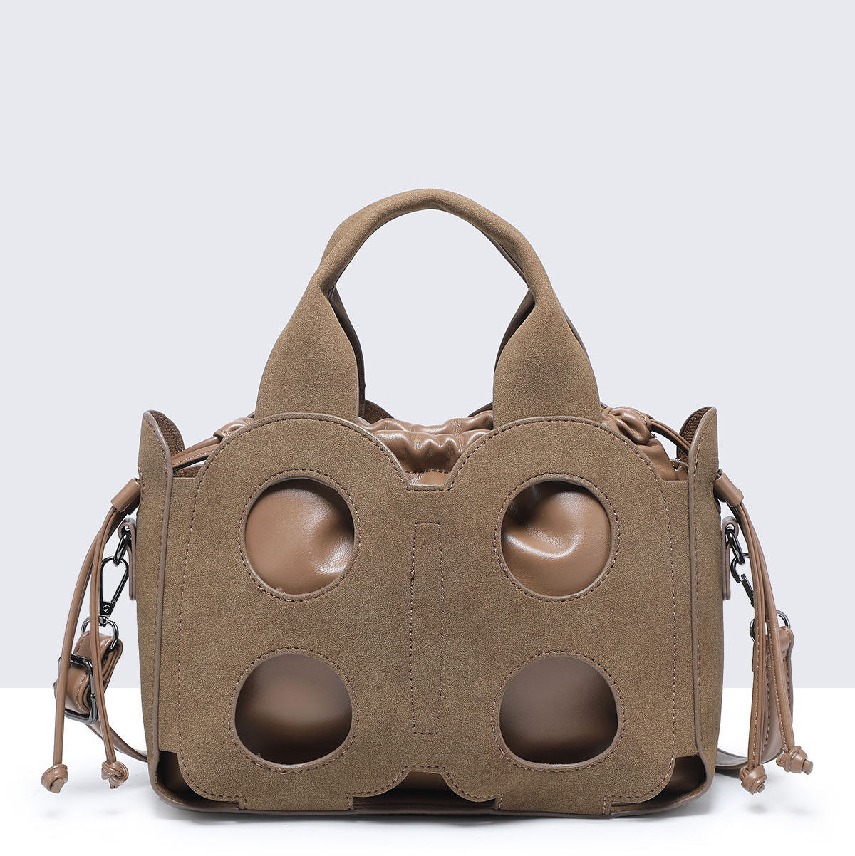 Torebka kuferek Baggy Cut to wyjątkowy model dla kobiet ceniących oryginalne formy. Wykonana z ażurowej osłony o nubukowym wykończeniu, kryje w sobie praktyczny worek z miękkiego materiału, który można nosić również samodzielnie. Model 2w1 daje swobodę stylizacji – elegancki kuferek z wycięciami albo minimalistyczna torebka w formie worka.