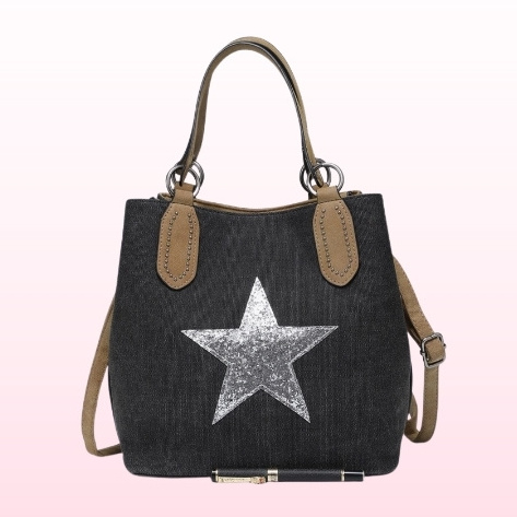 Torebka na ramię i do ręki Canvas Star czarna to wyjątkowy model, który łączy w sobie ponadczasową elegancję z nowoczesnymi trendami. Głównym elementem dekoracyjnym jest duża, błyszcząca gwiazda umieszczona na froncie, która nadaje całości unikalnego charakteru. Produkt został wykonany z wysokiej jakości płótna oraz wegańskiej skóry, co jest wyrazem dbałości o etyczną modę. Torebka posiada praktyczne uchwyty ozdobione dżetami oraz dodatkowy, regulowany pasek, umożliwiający noszenie jej na wiele sposobów. Wnętrze z logowaną podszewką wyposażono w bezpieczną kieszonkę na zamek, co ułatwia organizację najpotrzebniejszych przedmiotów. To idealna propozycja dla kobiet szukających luksusowego dodatku w przystępnym wydaniu.