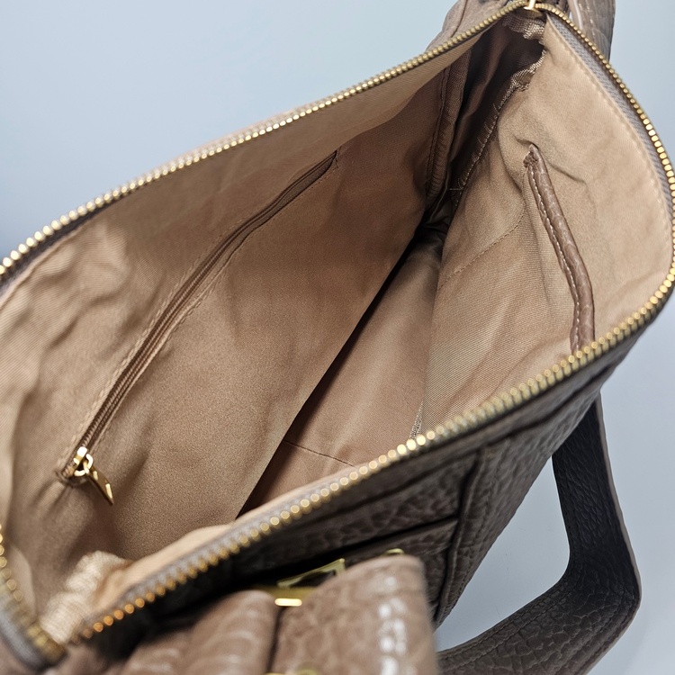 Model ma szeroki, regulowany pasek, który zapewnia wygodę noszenia zarówno na ramieniu, jak i w dłoni. Wnętrze wykończone podszewką oferuje przestronną komorę z kieszenią na zamek oraz otwartymi przegrodami na drobiazgi. Całość zapinana jest na zamek błyskawiczny.
