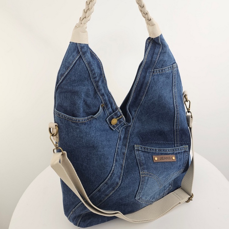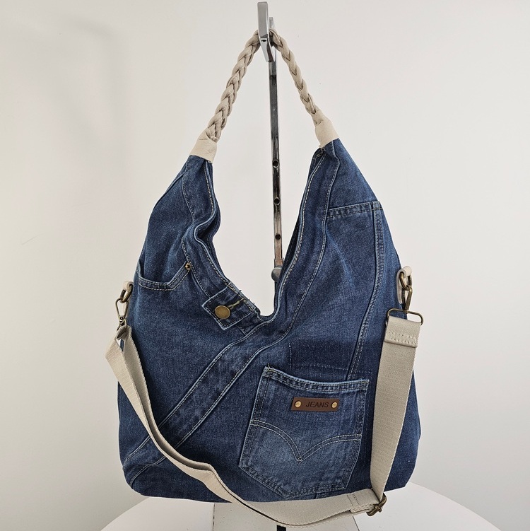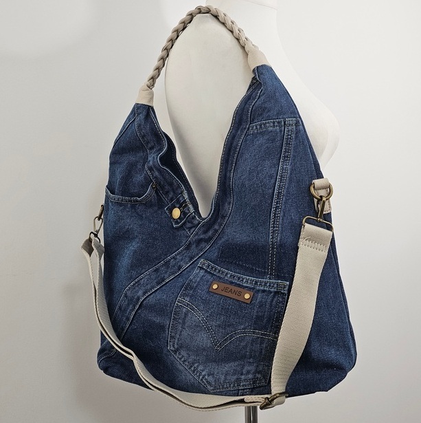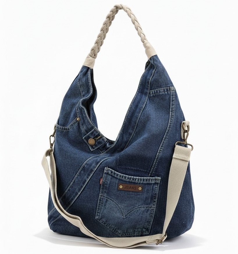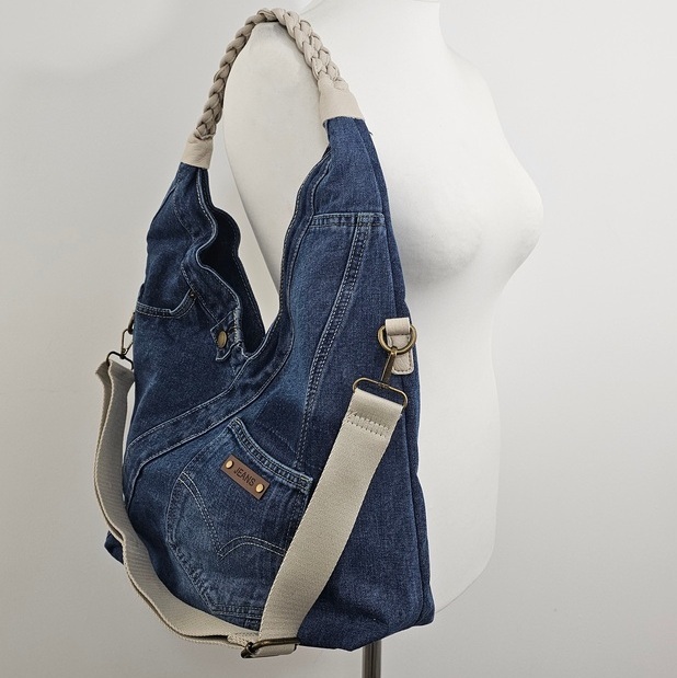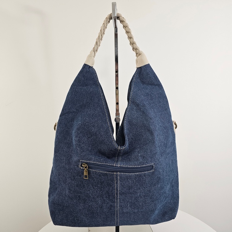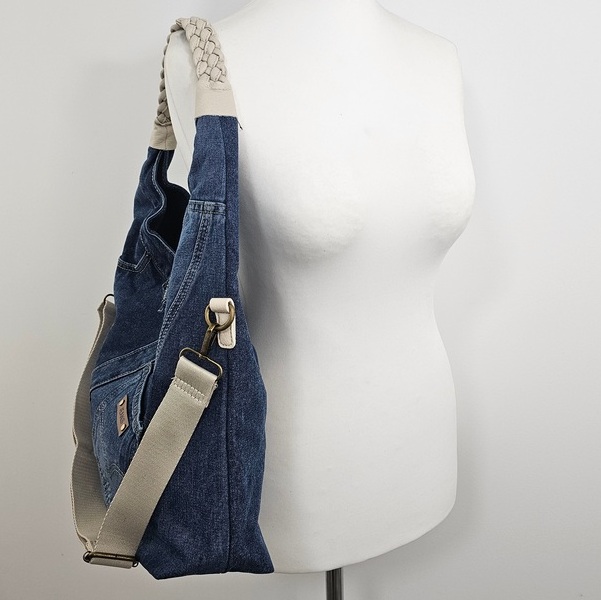 Torebka na ramię worek jeansowy Denim Hobo to propozycja dla tych, którzy potrzebują konkretnej pojemności bez rezygnacji ze stylu. Wykonana z bawełnianego jeansu, bez problemu mieści wszystko, co niezbędne w ciągu intensywnego dnia. Dzięki płaskiej podstawie Torebka na ramię worek jeansowy Denim Hobo zachowuje fason. Model wyposażono w pleciony uchwyt oraz dodatkowy, regulowany pasek, co pozwala nosić ją na wiele sposobów. Wewnątrz Torebka na ramię worek jeansowy Denim Hobo posiada beżową podszewkę, jedną komorę przedzieloną kieszenią na suwak oraz mniejsze przegródki na drobiazgi. Całość uzupełnia praktyczna kieszeń z tyłu, idealna na telefon.