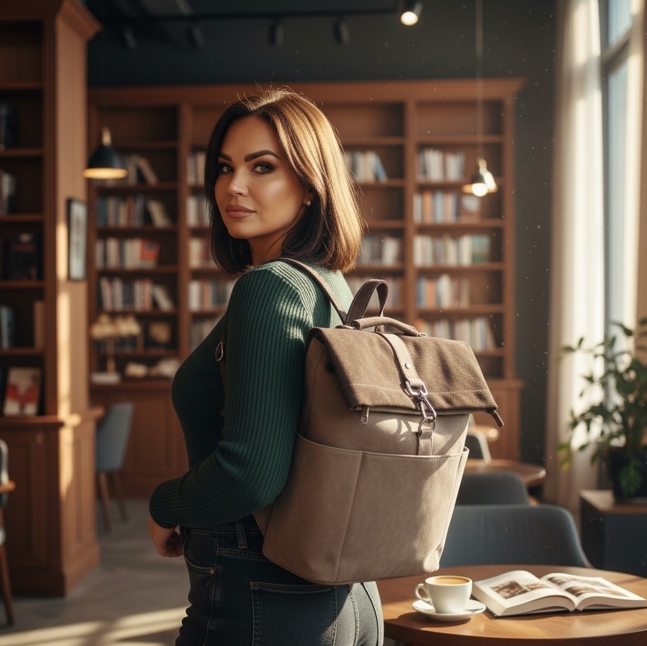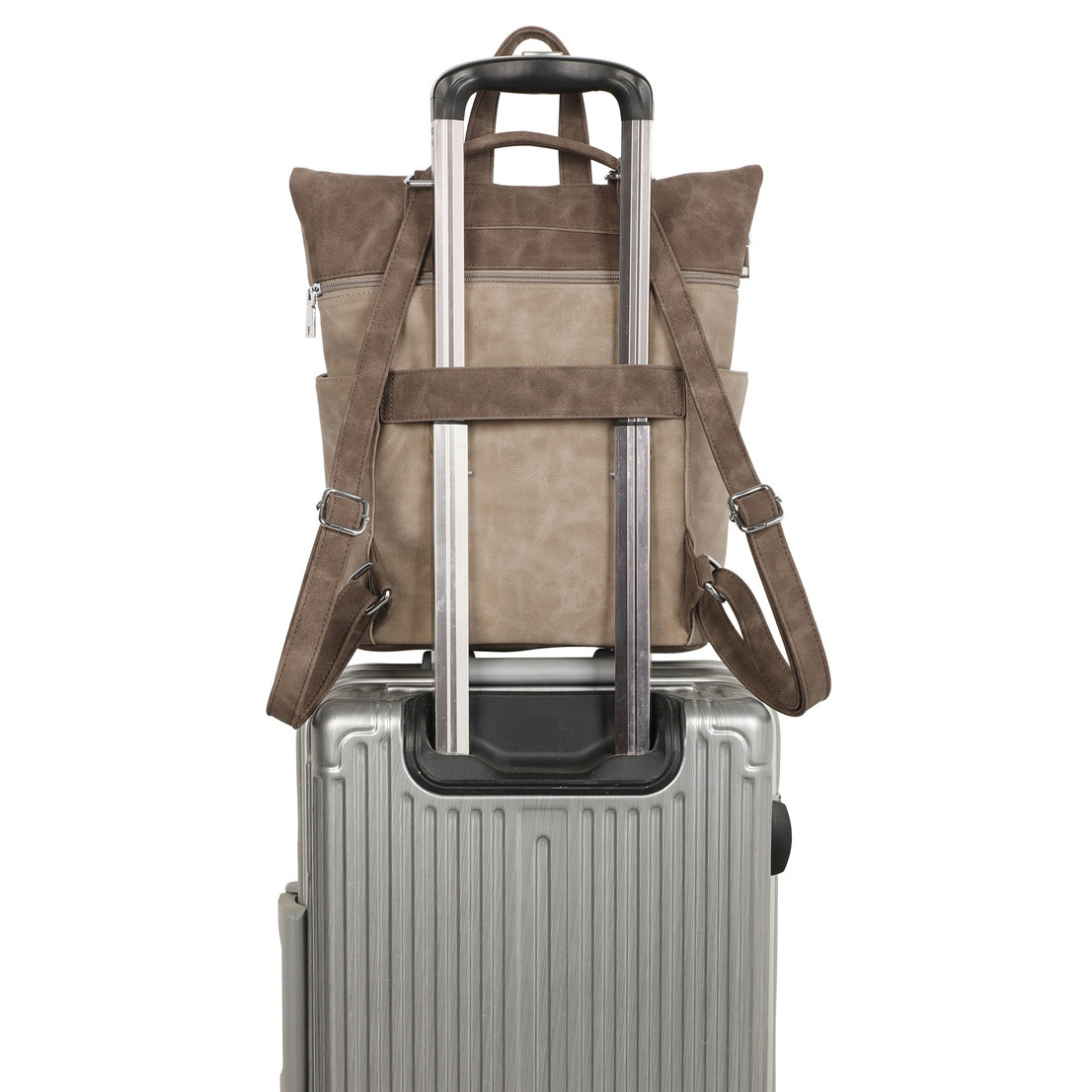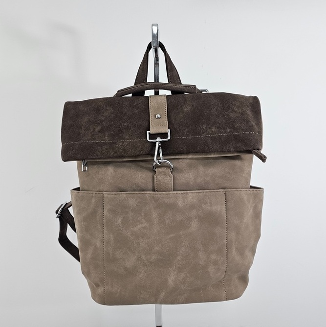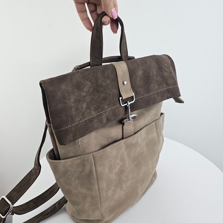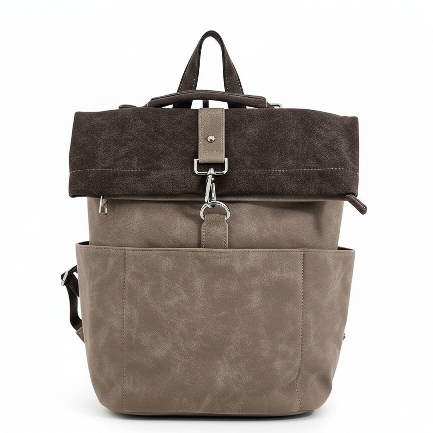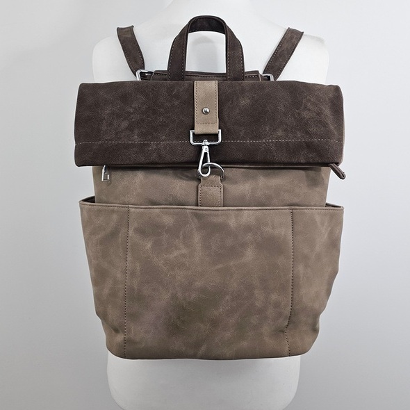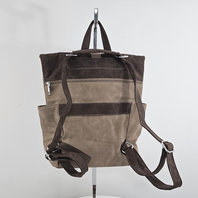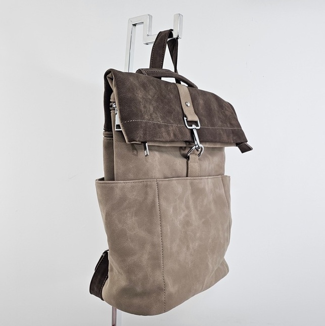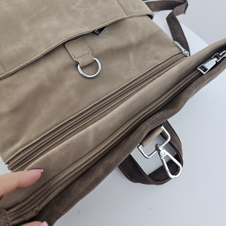 Torebko-plecak Voyager charakteryzuje się wysoką funkcjonalnością i przemyślaną konstrukcją. Wnętrze zostało podzielone na dwie osobne komory za pomocą praktycznej przegrody na suwak, co ułatwia segregację przedmiotów. Dodatkowe kieszenie wewnętrzne oraz dwie otwarte kieszenie boczne zapewniają miejsce na drobiazgi. Dostęp do głównej komory odbywa się poprzez zamek błyskawiczny umieszczony w klapie, co jest szybkim, bezpiecznym i wygodnym rozwiązaniem. Z tyłu znajduje się specjalny uchwyt umożliwiający stabilne zamocowanie produktu na rączce walizki, co czyni go idealnym wyborem na wyjazdy. Cała powierzchnia pleców została wykorzystana na bezpieczną, zamykaną kieszeń. Torebko-plecak Voyager wykonany jest z materiału o strukturze nubuku, łącząc estetykę z codzienną użytecznością.