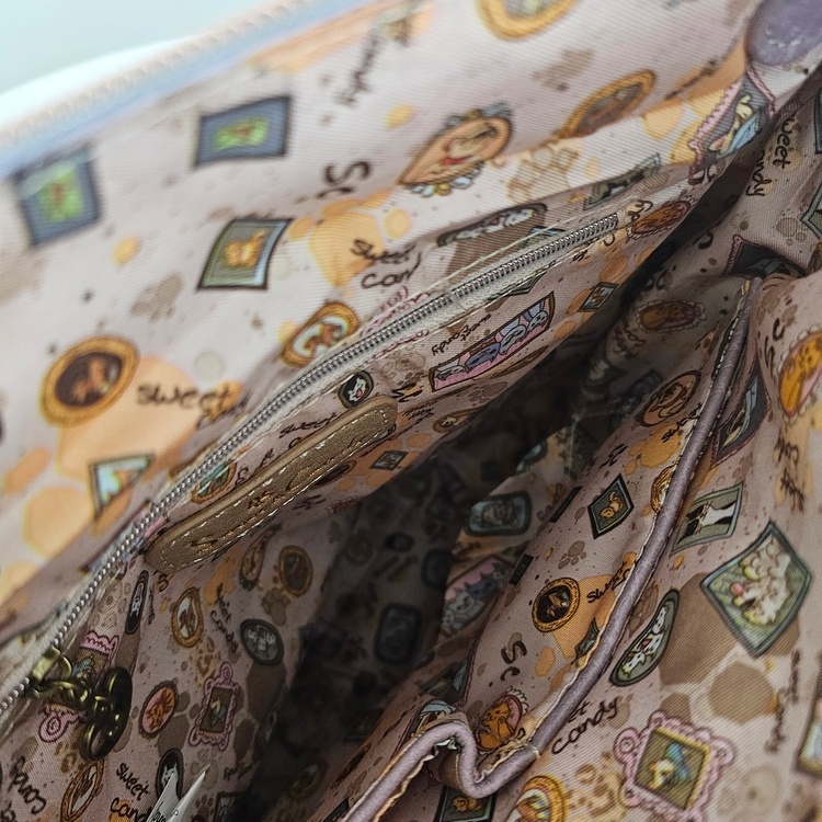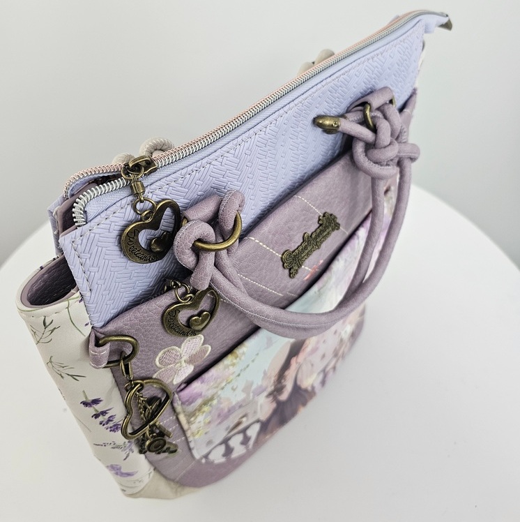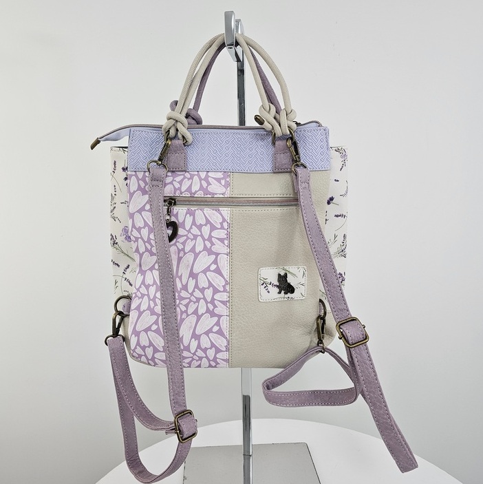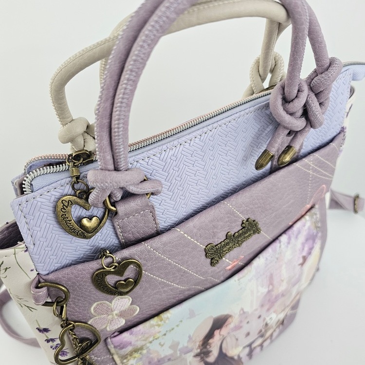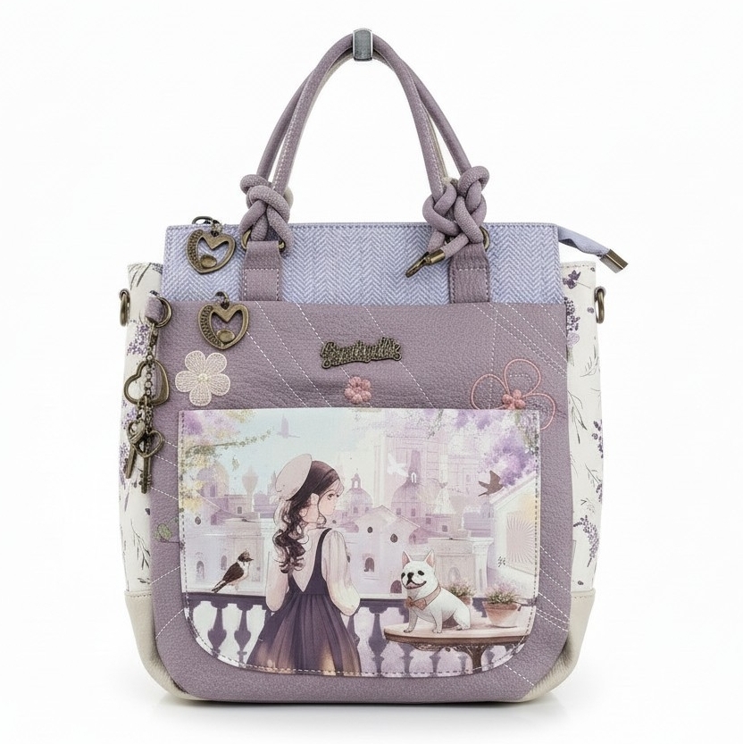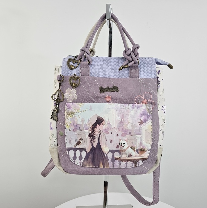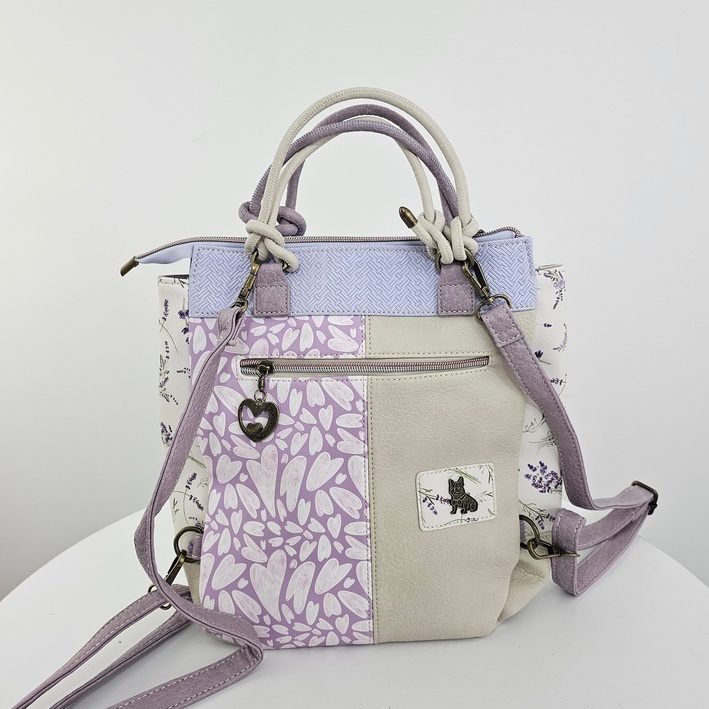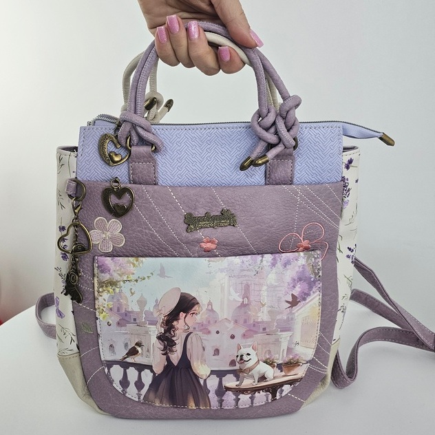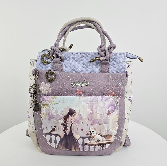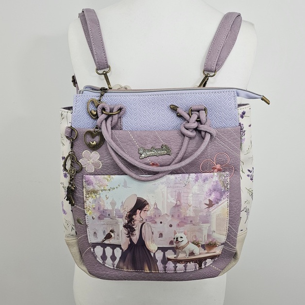 Torebko-plecak z brelokiem Forever to wielofunkcyjny model 2w1, który z łatwością zmienia się z klasycznej torebki do ręki w wygodny plecak. Produkt charakteryzuje się bogatym wzornictwem z motywem postaci oraz dbałością o detale. Front zdobi duża kieszeń z organizerem oraz mniejsza, naszywana przegródka. Główna komora oraz kieszenie zewnętrzne są zabezpieczone zamkami błyskawicznymi z ozdobnymi uchwytami w kształcie serc. Całość uzupełnia efektowny brelok z motywem psa, zamocowany na boku. Torebko-plecak posiada krótką rączkę oraz dwa regulowane paski na plecy, co zapewnia komfort noszenia w każdych warunkach. Wnętrze z estetyczną podszewką wyposażono w boczną kieszeń na suwak oraz przegródki na drobne przedmioty. Płaska i usztywniona podstawa gwarantuje stabilność produktu po odstawieniu.