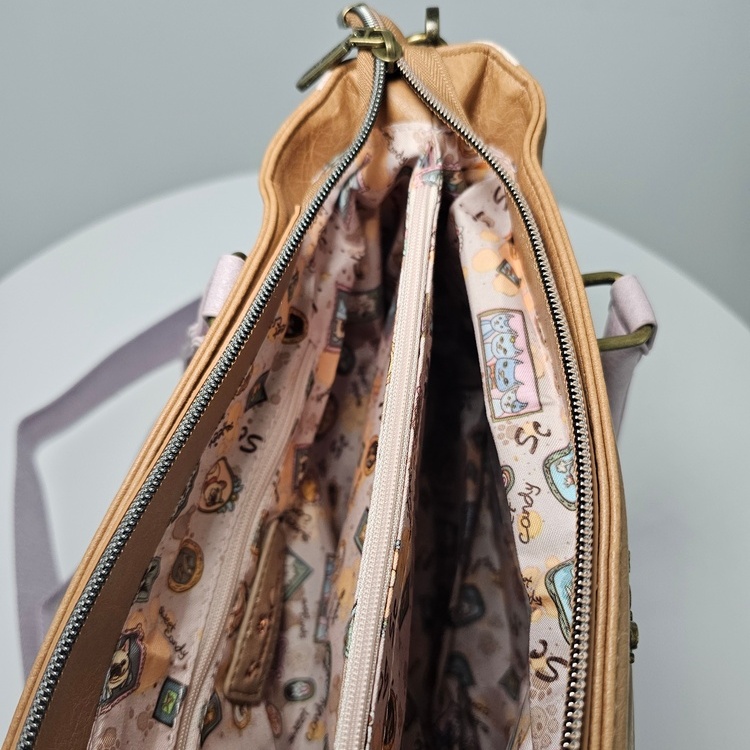 Wnętrze jest wyściełane podszewką i oferuje dużą pojemność. Jedna z głównych komór ma kieszonkę na suwak, druga – organizer na drobiazgi, takie jak klucze czy monety. Dodatkowa kieszeń na suwak dzieli wnętrze na dwie części, zapewniając wygodną organizację przestrzeni.